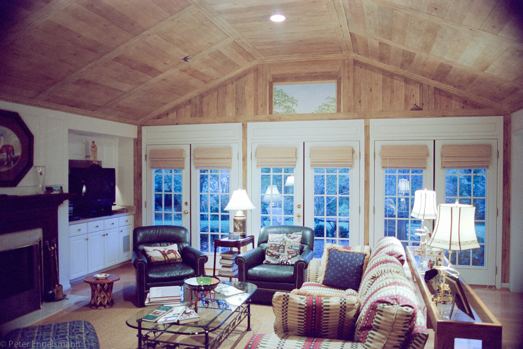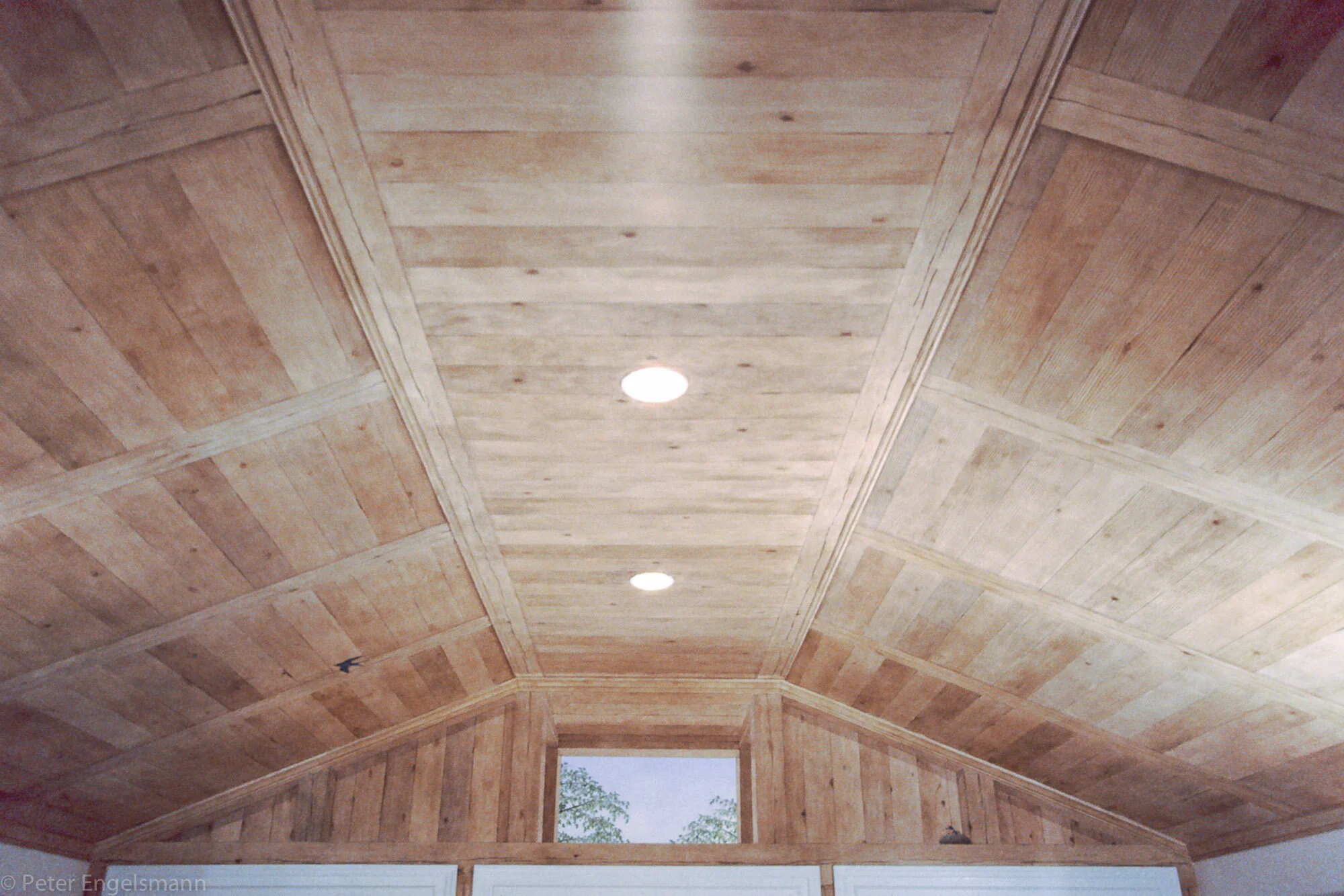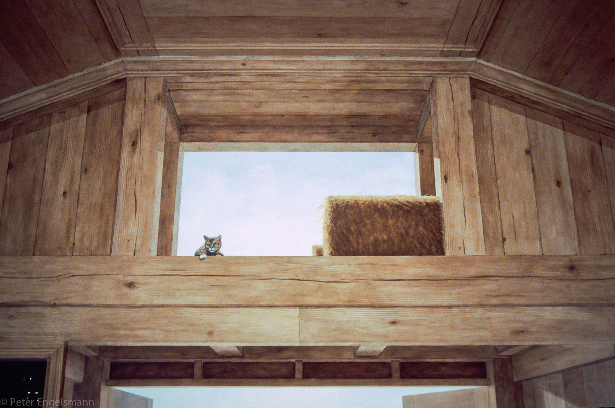 Trompe l'oeil wood barn. 16' x 12', 16' x 4' walls, 20' x 32' ceiling, hand-painted acrylic on wallboard, private residence